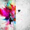 Inspired by B reimagines Banksy’s iconic Girl with Balloon through Lee’s bold and expressive digital vision. The familiar silhouette of a young girl reaching toward a heart-shaped balloon is split between two worlds, one vibrant with splashes of pink, red, blue, and yellow, the other quiet and monochrome. This striking contrast reflects the tension between innocence and experience, hope and loss.