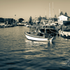 - Subject: Lone motorboat in sepia-toned waters with docked boats and Creekside homes
